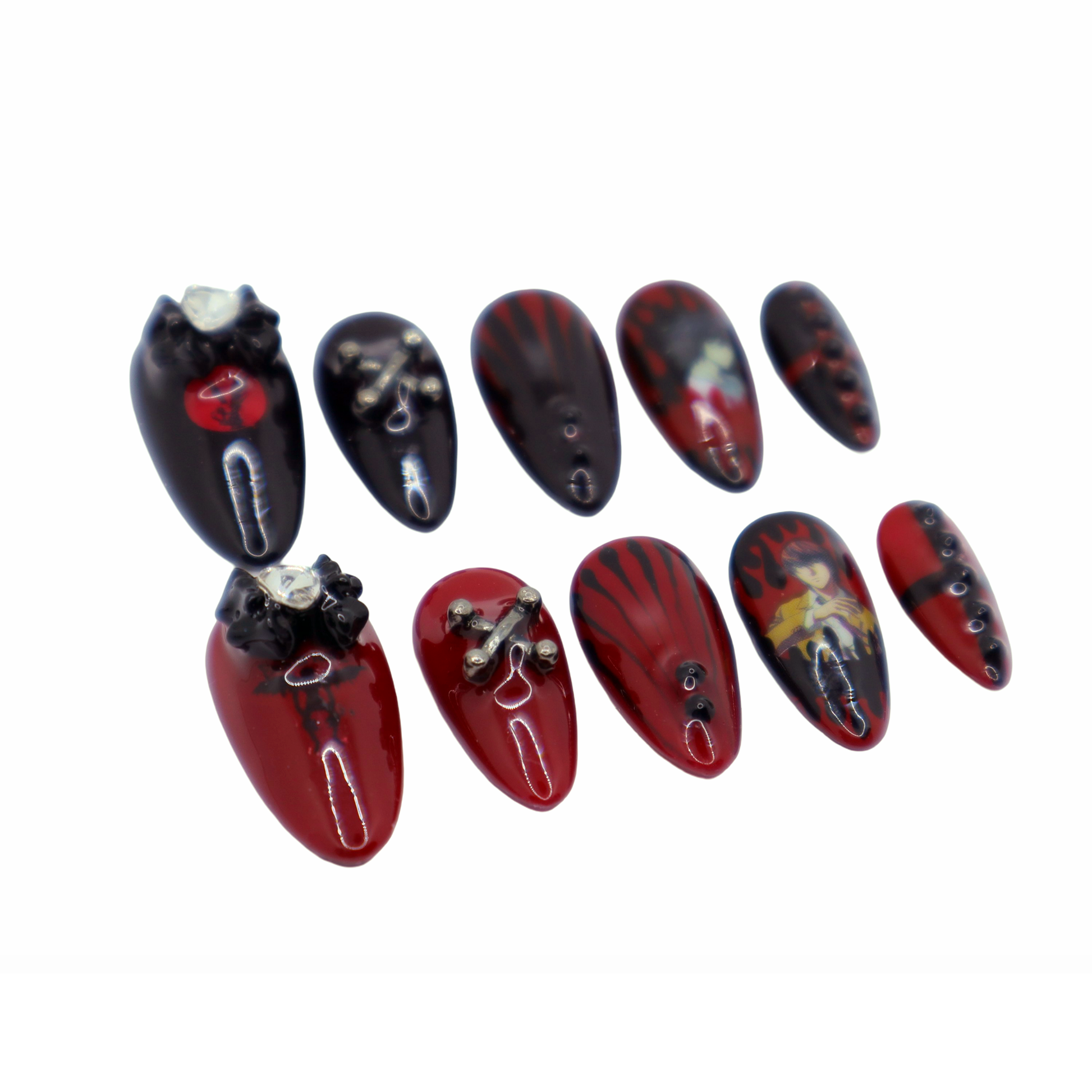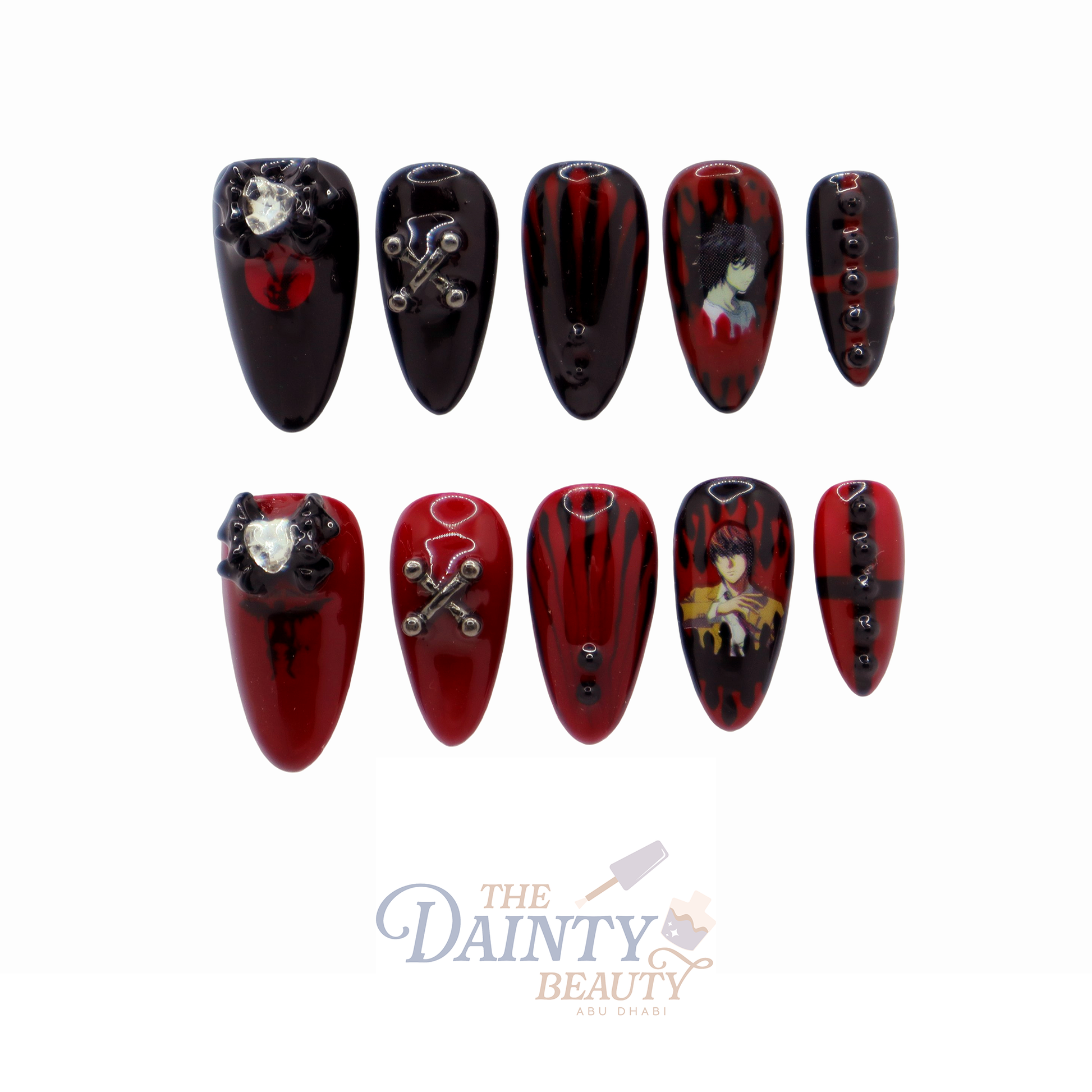 A one-of-a-kind nail design inspired by the legendary anime Death Note. Featuring a deep black base drenched in vivid, blood-like red accents which tells a silent story of vengeance, justice, and inevitable death.