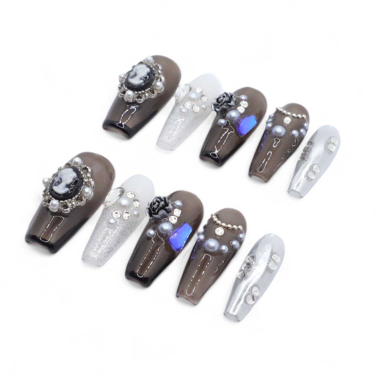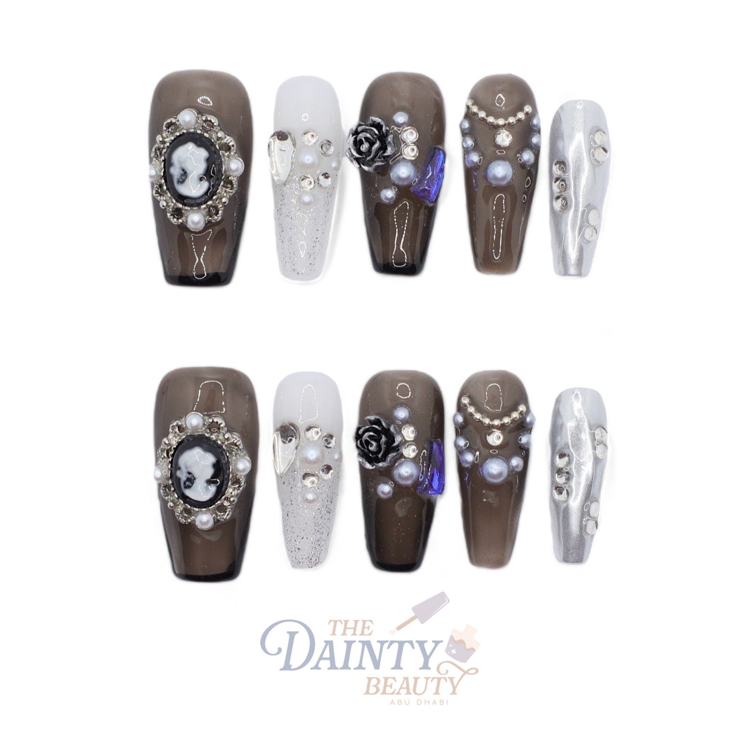 Evoking the thrill of a dark masquerade ball. Each nail is a canvas of intrigue, featuring deep, mysterious elements reminiscent of ornate masks shimmering under dim candlelight.