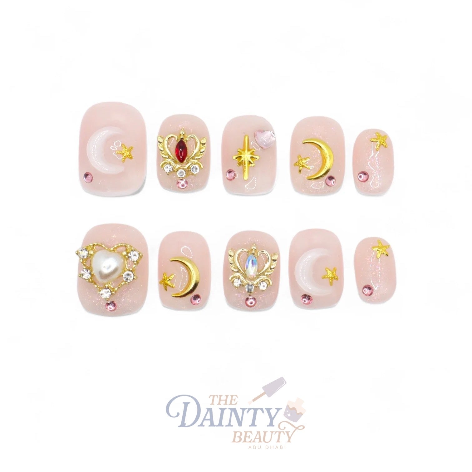 A soft nude shade, adorned with delicate heart and moon-shaped charms. The hearts symbolize love and affection, while the moons add a touch of celestial enchantment. Together, they create a unique look that's both romantic and dreamy.
