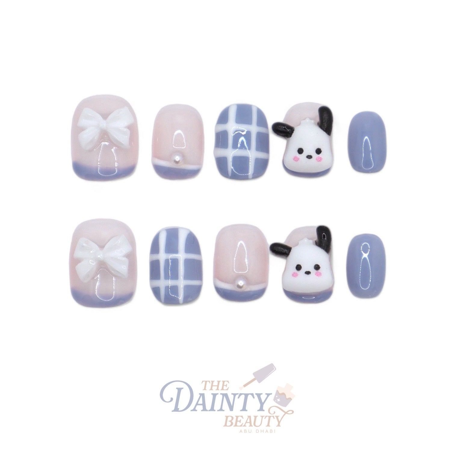 Give your style a fun twist with nails showcasing Pochacco in a charming dusty blue hue, adding an adorable touch to your look!